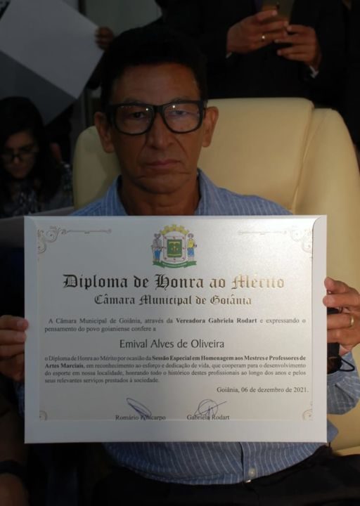 O Instrutor da ESPC e policial civil Emival Alves de Oliveira, conhecido entre os colegas como Mestre Emival, recebeu da vereadora Gabriela Rodart em sessão realizada no dia 06 de dezembro de 2021 o Diploma de Honra ao Mérito por ocasião da Sessão Especial em Homenagem aos Mestres e Professores de Artes Marciais, em reconhecimento ao esforço e dedicação de vida, que cooperam para o desenvolvimento do esporte.
